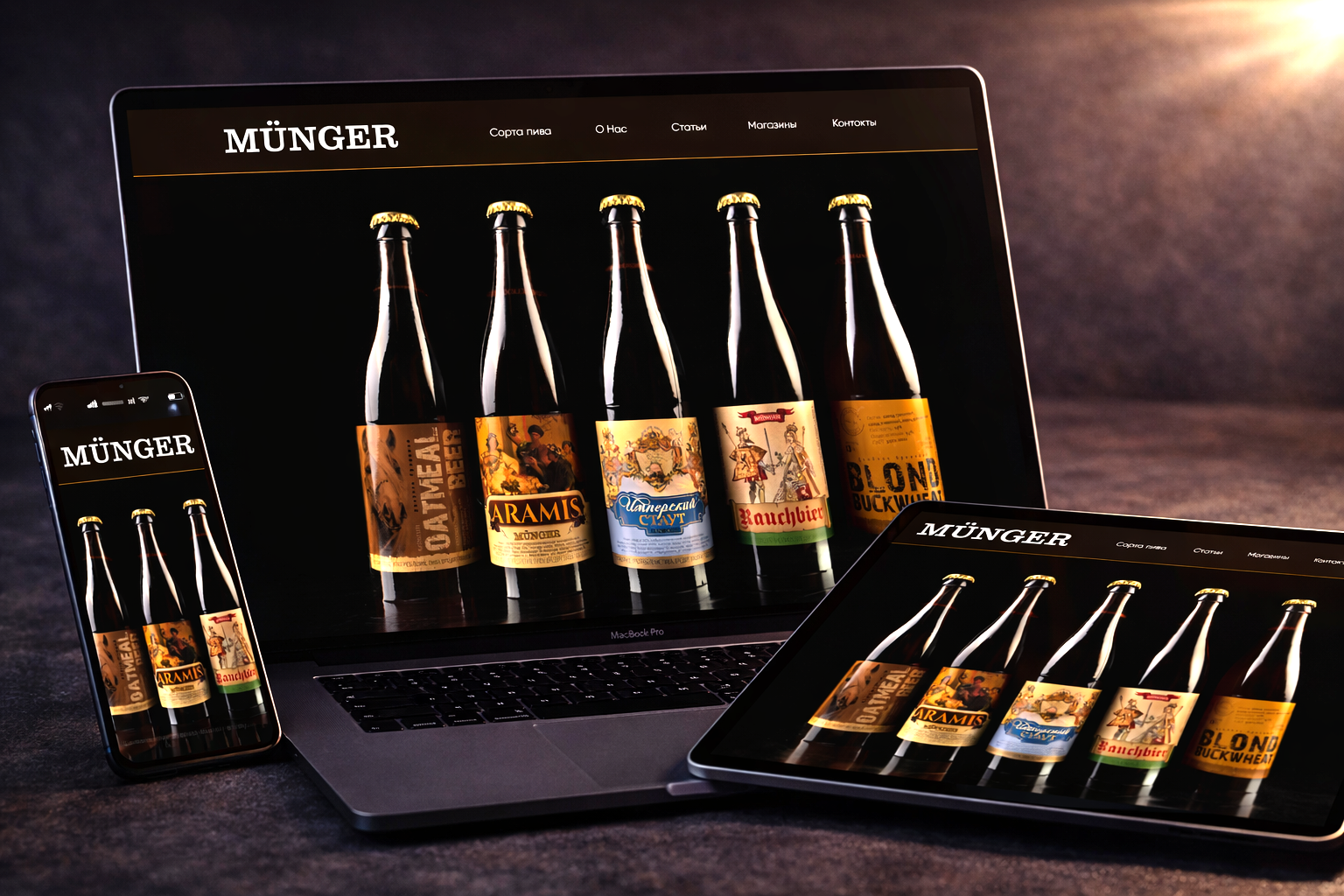 Бутылки на Munger.ru выстроены как оркестр перед первым аккордом: темное стекло, золотые крышки, этикетки с характером и историей. Лучшие сайты для интернет-магазинов пенных напитков продают желанное настроение, страстную историю и выбор покупателя с сильным характером. Веб-дизайн сразу погружает в атмосферу  уважения к напитку — без суеты, с достоинством, с паузой на вкус. Черный фон работает как бархатная сцена, усиливая цвет, форму и типографику, превращая ассортимент в коллекцию, а выбор — в ритуал.