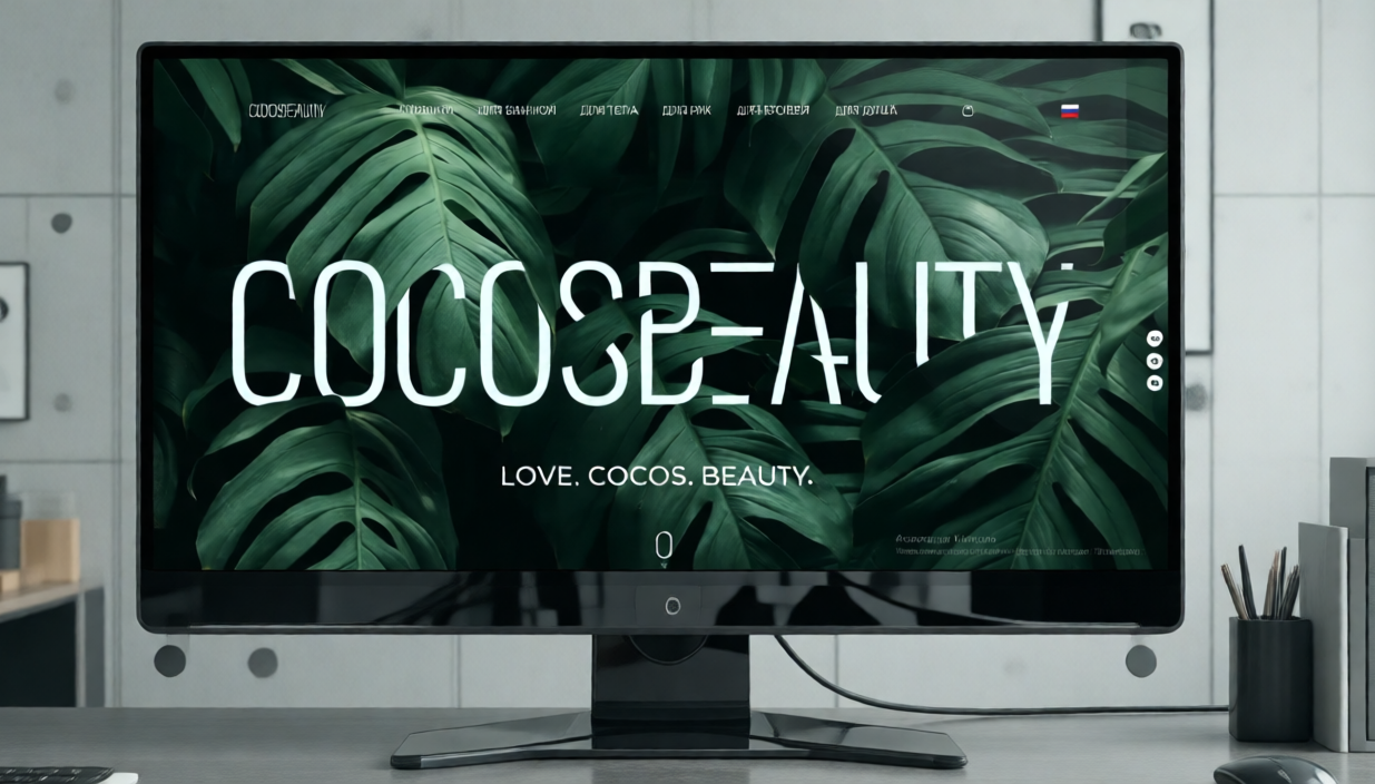 Листья монстеры разрастаются по всему визуальному полю, будто лучший сайт для интернет-магазина дышит медленно и уверенно, задавая ритм покупкам, как наслаждению потребителя. Главная страница Cocosbeauty.shop сразу выводит бренды из каталога в зону эстетического переживания: здесь продают не баночки со скрабом, а ощущение ухоженности, ритуала, тактильного удовольствия.